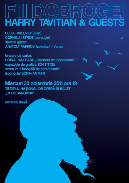 Aceasta este, cu adevarat, cred eu, stirea care ar trebui sa fie cap de afis pentru urbea noastra. Dupa mult-mult timp, prea mult, Maestrul Harry Tavitian se intoarce acasa, cu un concert intr-o sala mare, prea mica pentru statura sa de artist, dar cea mai mare pe care Constanta o poate pune la picioarele unui Fiu al Dobrogei triumfator. Miercuri, 30 noiembrie 2011, de la ora 19.00, in sala Teatrului de Opera si Balet „Oleg Danovski” se va desfasura „festinul” de jazz Harry Tavitian & Guests, o reunire a FIILOR DOBROGEI, unde vor fi prezenti, alaturi de Maestrul Harry, Delia Pavlovici (pian), Corneliu Stroe (percutie) si invitatul special Anatoly Vapirov (saxofon) – Varna.