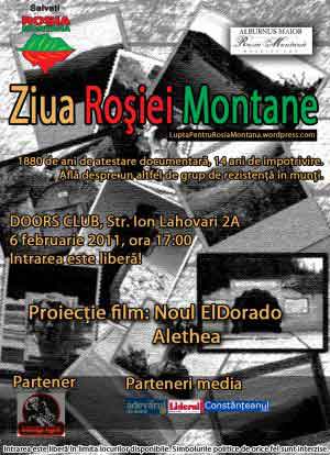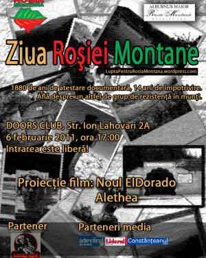 Duminica, 6 februarie, de la ora 17:00, sunteti invitati la Clubul Doors (str. Ion Lahovari 2A), unde se va defasura „Ziua Rosiei Montane”. Evenimentul este organizat de Grupul local al sustinatorilor miscarii “Salvati Rosia Montana” cu ocazia implinirii a 1880 de ani de la prima atestare documentara a Rosiei Montane.