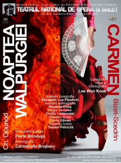 afis carmen +Compania de balet din cadrul TNOB “Oleg Danovski” prezinta Duminica, 31 Martie ora 19.00, premiera spectacolelor de balet “Carmen” si “Noaptea Valpurgiei”. Pe muzica lui Bizet (adaptare Scedrin) si a lui Charles Gounod, spectacolele au ca si coregrafi doua nume cunoscute atat pe plan national cat si international: Lee Won Kook si Florin Brindusa.