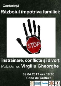 afis razboiul familiaProfesorul in bioetica, Virgiliu Gheorghe, autor al mai multor scrieri despre influenta televiziunii si internetul asupra comportamentului uman, sustine marti, 9 aprilie 2013, incepand cu ora 18.00, la Casa de Cultura din Constanta, o conferinta despre Razboiul impotriva familiei.