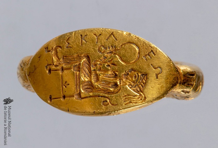 Inel de tip sigilar, din aur; în zona chaton-ului este redat un personaj feminin (privind spre stânga) șezând pe un tron (jilț), având picioarele sprijinite pe un alt mic scaun (taburet). Personajul poartă o parură elaborată, compusă (aparent) dintr-o diademă (tiară) și o coadă împletită (din păr de cal ?) sau un văl ridicat în partea posterioară a capului, fiind îmbrăcat cu o rochie lungă și purtând în picioare încălțări cu vârf ascuțit și răsucit. În mâna dreaptă ţine o oglindă, iar în cealaltă o floare (crin sau lotus). Pe latura stângă a peceții, în poziție antitetică față de reprezentarea figurată, (realizată prin incizare) inscripția ΣΚΥΛΕΩ/Skuleo – forma greacă a genitivului posesiv „aparţin lui Skyles”.