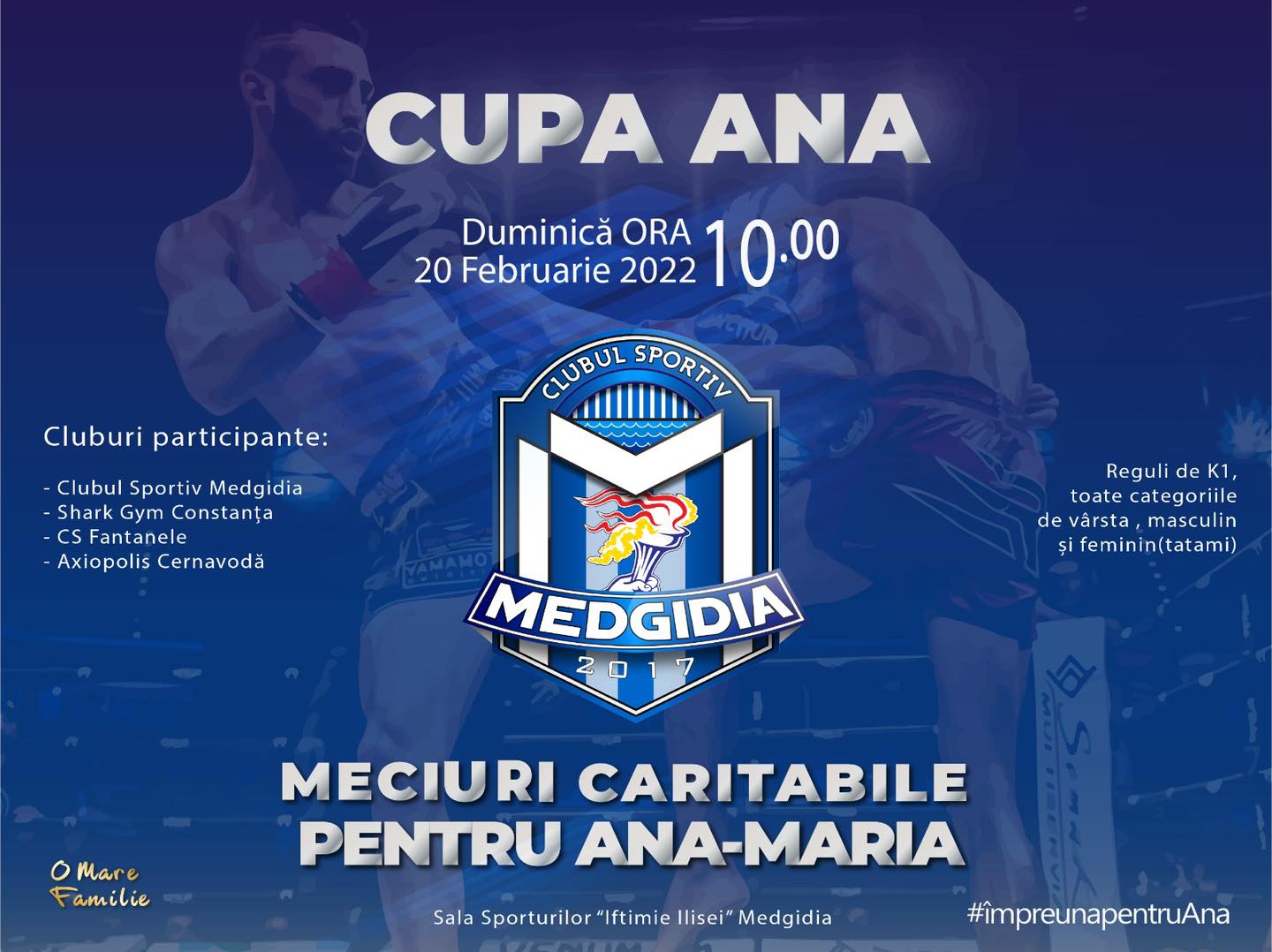 Astfel, duminică, de la ora 10.00, sportivi de toate vârstele de la 4 cluburi, CS Medgidia, Shark Gym Constanța, CS Fântânele și Axiopolis Cernavodă, se vor întrece la “Cupa Ana”, o competiție rezervată sporturilor de contact, atât la feminin, cât și la masculin. Evenimentul se va desfășura în Sala Sporturilor “Iftimie Ilisei”, pe tatami, după reguli de K1. Scopul este de a strânge suma necesară pentru tratamentul care să-i ofere fetiței șansa la o viață normală. “Pentru Ana-Maria, avem nevoie să fim mulți oameni, mulți copii, mulți părinți și mulți suporteri cu suflet mare”, a anunțat CS Medgidia.