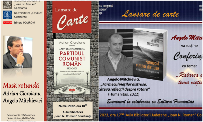Biblioteca Județeană „Ioan N. Roman” Constanța, în colaborare cu Universitatea „Ovidius” din Constanța, organizează joi, 26 mai 2022, ora 18.00, în Aula Bibliotecii, o Masă Rotundă, avându-l ca invitat pe istoricul și profesorul universitar de la Facultatea de Istorie a Universității din București, Adrian Cioroianu, editorul volumului „A fost odată ca niciodată Partidul Comunist Român 1921-1924. Pentru o istorie dezinhibată a viitorului luminos”, (Polirom, 2021) în dialog cu prof. univ. dr. habil Angelo Mitchievici (Universitatea „Ovidius” din Constanța).
