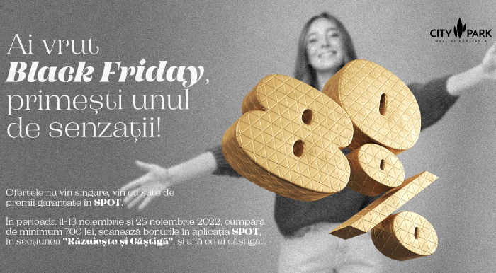 Pe 11 noiembrie City Park Mall anunță startul campaniei Black Friday de senzații, cu reduceri de prețuri de până la 80% în magazinele preferate, dar și cu premii și extra beneficii garantate pentru clienții care își instalează aplicația SPOT.
