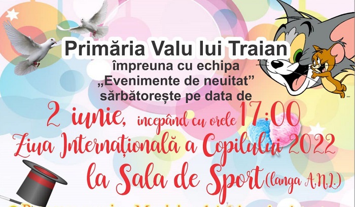 Primăria Valu lui Traian, împreună cu echipa ”Evenimente de neuitat”, sărbătorește ZIUA INTERNAȚIONALĂ A COPILULUI, pe data de 2 iunie 2022, începând cu ora 17.00, la Sala de Sport (lângă ANL).