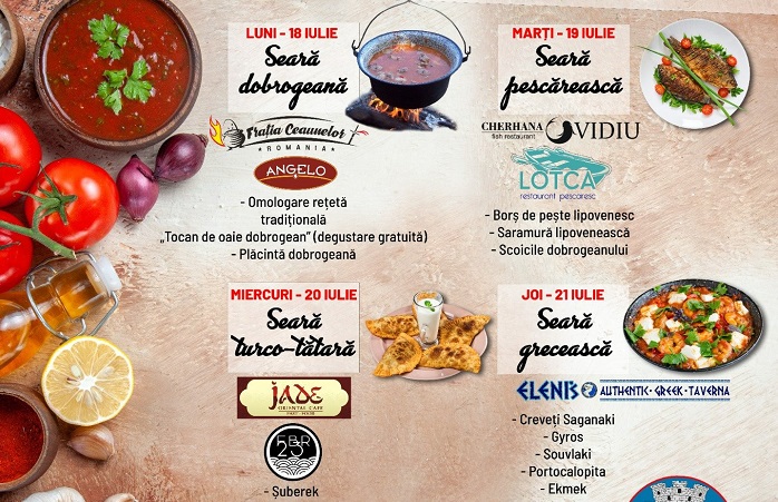 Serile dedicate gastronomiei dobrogene se desfășoară zilnic, în perioada menționată, începând cu ora 18.00, în binecunoscuta locație Parc Zonă Relaxare - plajă