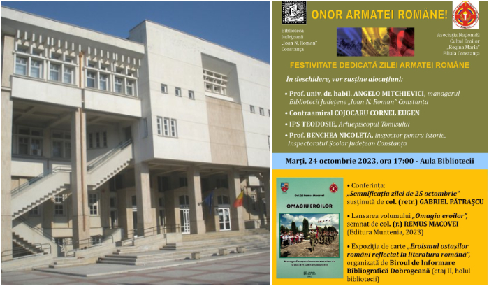 Asociația Națională Cultul Eroilor „Regina Maria” Filiala Constanța și Biblioteca Județeană „Ioan N. Roman” Constanța organizează marți, 24 octombrie 2023, ora 17.00, în Aula Bibliotecii Județene Constanța, evenimentul „Onor Armatei Române!”, dedicat Zilei Armatei Române - 25 octombrie