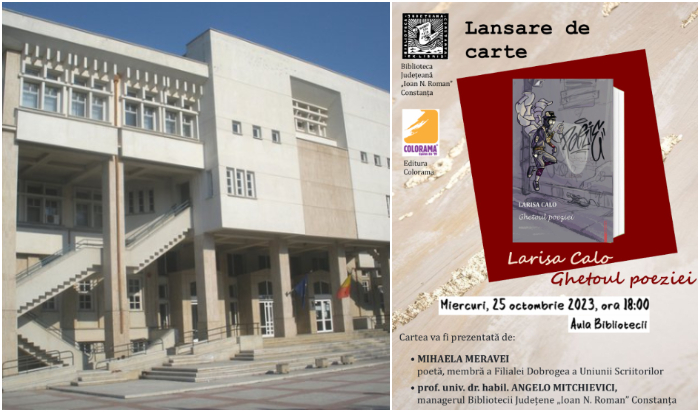 Biblioteca Județeană „Ioan N. Roman” Constanța organizează miercuri, 25 octombrie 2023, de la ora 18.00, în Aula Bibliotecii, lansarea cărții scriitoarei Larisa Calo, „Ghetoul poeziei”.