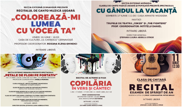 De asemenea, Secția Externă Cernavodă a Centrului Cultural Județean Constanța ,,Teodor T. Burada’’ a pregătit pentru vineri, 16 iunie, ora 16.00, la Casa de Cultură ,,I. D. Chirescu’’, recitalul de Canto Muzică Ușoară ,,Colorează-mi lumea cu vocea ta’’. Profesor coordonator: Roxana Elena Ghindici.