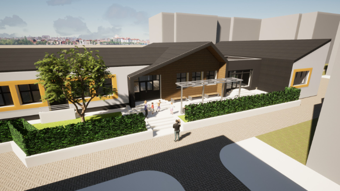 – construirea unui vestibul pe partea de vest a clădirii actuale pentru a facilita accesul copiilor la locul de joacă și a crea un paravan (windfang) pentru a limita pierderile de căldură;