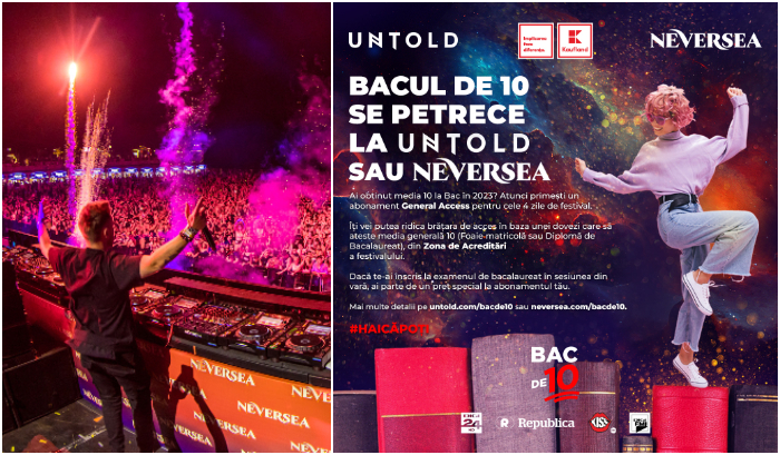 Toți elevii care obțin nota 10 la examenul de Bacalaureat primesc un abonament gratuit de patru zile la UNTOLD sau Neversea și un voucher de cumpărături de 500 de lei din partea Kaufland România, partener al acestei campanii.