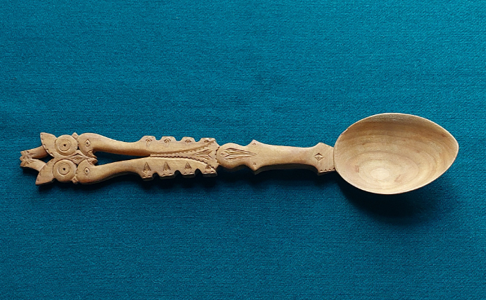 Lingura, cioplită din lemn de cireş, face parte din colecţia de artă contemporană a muzeului, fiind lucrată de meşterul popular Marian Viorel din Fălticeni, judeţul Suceava, prin tehnici tradiţionale precum: crestat, incizat, excizat, perforat.