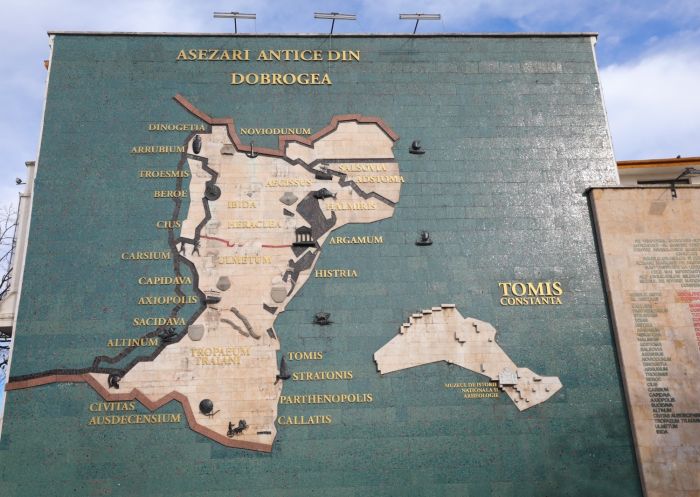 Restaurarea hărții siturilor arheologice din Dobrogea, amplasată pe calcanul clădirii Curții de Conturi Constanța, este aproape de finalizare.