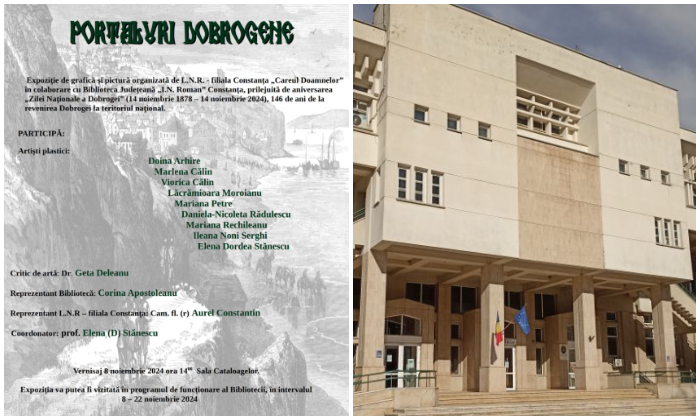 Expoziția de grafică și pictură PORTALURI DOBROGENE este organizată de Liga Navală Română – filiala Constanța „Careul Doamnelor”, în colaborare cu Biblioteca Județeană „,I.N. Roman” Constanța, cu prilejul Zilei Naționale a Dobrogei (14 noiembrie 1878 – 14 noiembrie 2024), 146 de ani de la revenirea Dobrogei la teritoriul național.