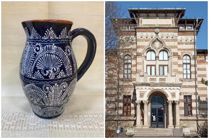 Motivele decorative sunt pictate cu angobă albă pe fond albastru de cobalt, amintind de tradiția ceramicii albastre săsești din Saschiz, Mureș.