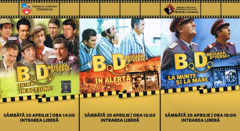 Tot sâmbătă, 20 aprilie 2024, cinefilii se vor bucura de o după-amiază de film românesc, fiind invitați să (re)vadă pe marele ecran mini-serialul Brigada diverse, după cum urmează: 20 aprilie, ora 14:00 – ”B.D. intră în acțiune”, ora 16:00 – ”B.D. în alertă!” și ora 18:00 –”B.D. la munte și la mare”.