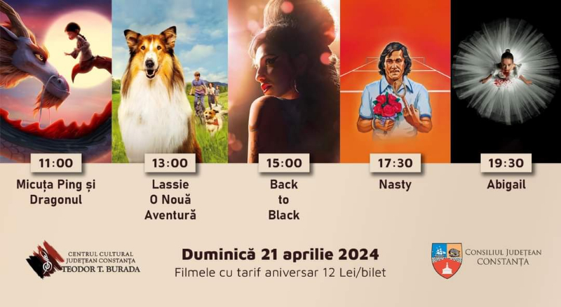 Duminică, 21 aprilie 2024, în sala mare a CMEPT ”Jean Constantin” vor rula cele mai noi producții cinematografice ale momentului. Biletele la proiecții au tarif aniversar – 12 lei/ bilet și se pot achiziționa de la casieria CMEPT „Jean Constantin” sau online, după cum urmează: