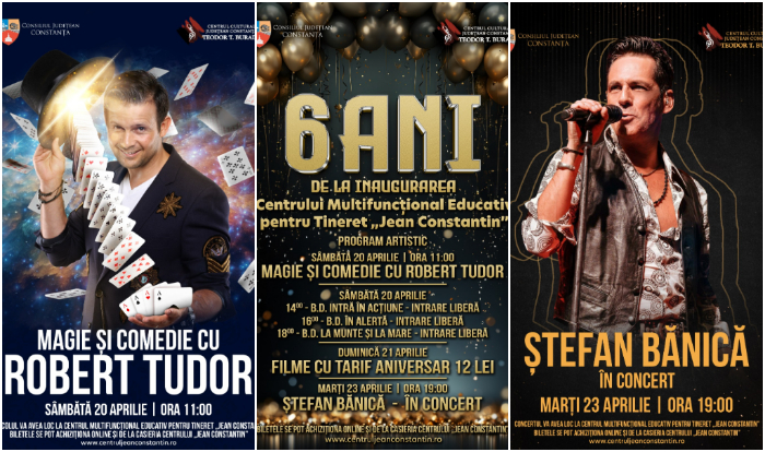 Cinefilii și pasionații de artă, muzică live și super-show-uri de magie, comedie și actorie, sunt așteptați, în perioada 20 – 23 aprilie 2024, la evenimentele aniversare organizate de Consiliul Județean Constanța, prin Centrul Cultural Județean Constanța „Teodor T. Burada”, în cadrul ,,Zilelor Centrului Multifuncțional Educativ pentru Tineret Jean Constantin – 6 ani de la inaugurare”