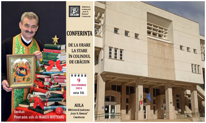 Luni, 9 decembrie 2024, ora 16:00, la Biblioteca Județeană „Ioan N. Roman” Constanța va avea loc a doua conferință susținută de Părintele Marius Moșneanu: „De la urare la stare în Colindul de Crăciun”. Părintele vă invită să ascultați un grupaj de colinde, în interpretarea Coralei Bisericii Sfântul Nicolae Vechi din Constanța, condusă de către dirijorii pr. Marian Dragomir și Ciprian Gavrilă. Restul este despre Emoția, Armonia și Mărturia pe care părintele se va strădui să le așeze în inima celor dornici să-l asculte.