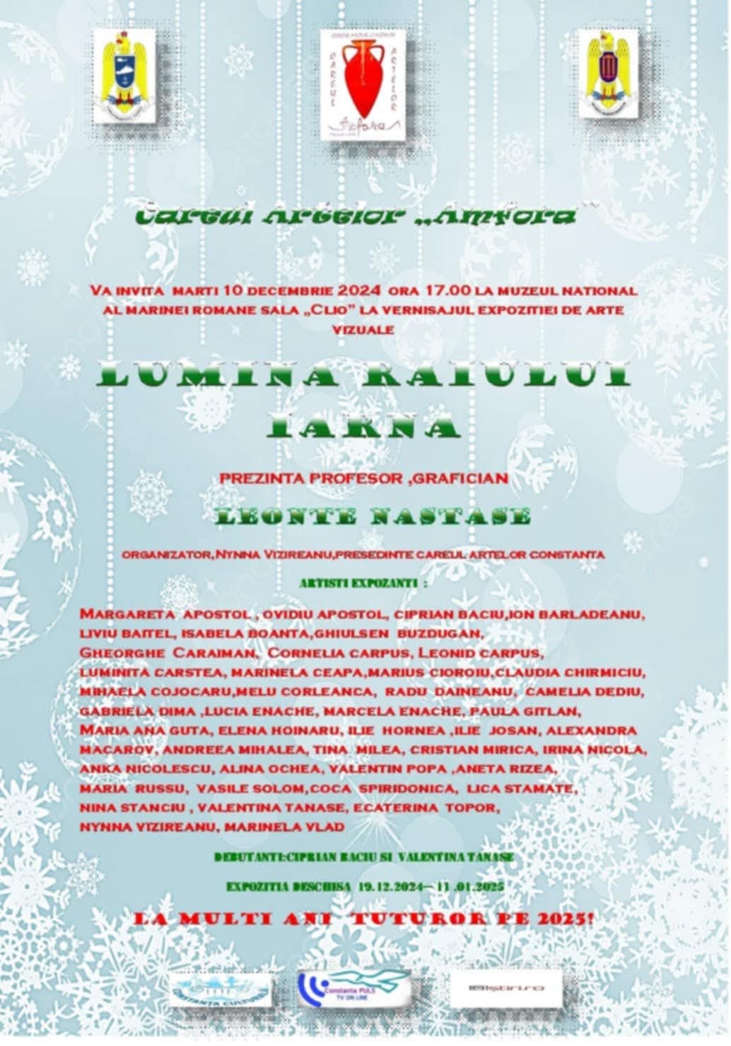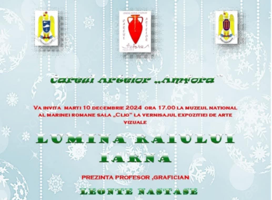 Careul Artelor Amfora vă invită marți, 10 decembrie 2024, ora 17.00, la vernisajul expoziției de arte vizuale LUMINA RAIULUI, IARNA, ce va avea loc la Muzeul National al Marinei Române, în Sala „Clio"