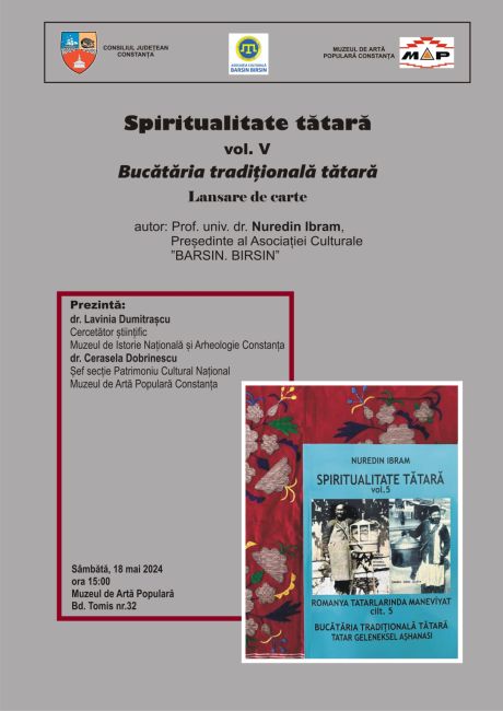 Muzeul de Artă Populară Constanța și Asociația de Cultură Tătară „Barsin. Birsin” („Exiști. Ești unic”) organizează sâmbătă, 18 mai 2024, de la ora 15.00, lansarea de carte din seria „Spiritualitate tătară”, volumul V, „Bucătăria tradițională tătară”, autor prof. univ. dr. Nuredin Ibram.