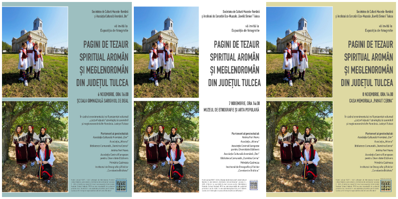 Societatea de Cultură Macedo-Română, în colaborare cu Institutul de Cercetări Eco-Muzeale Gavrilă Simion Tulcea vă invită la triplul eveniment organizat pentru prezentarea expoziției de fotografie ”Pagini de tezaur spiritual aromân și meglenoromân din județul Tulcea”