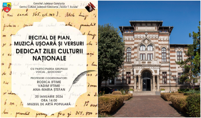 Sâmbătă, 20 ianuarie 2024, de la ora 14.00, Muzeul de Artă Populară Constanța va fi gazda unui Recital de pian, muzică ușoară și versuri, susținut de Grupul Vocal „Giocoso” (profesori coordonatori Rodica Iftime, Vadim Iftime, Ana-Maria Ștefan).