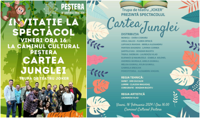 Actorii vor prezenta spectacolul CARTEA JUNGLEI, o piesă de teatru adresată atât celor mici, cât și celor mari.