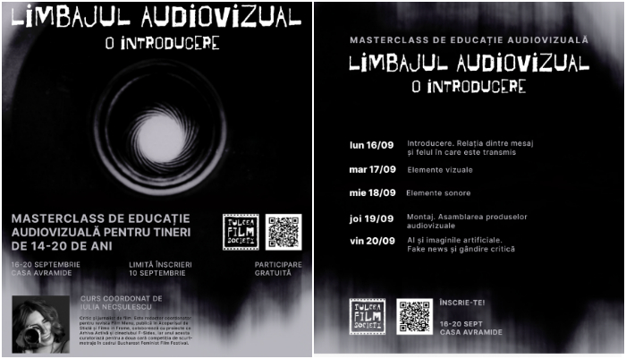 Liceenii din Tulcea sunt invitați să se înscrie - PARTICIPARE GRATUITĂ - la masterclass-ul Limbajul audiovizual, o introducere, susținut de Iulia Necșulescu, ce va avea loc în perioada 16-20 septembrie 2024, la Casa Avramide