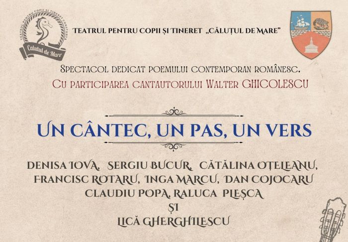 Joi, 05 decembrie 2024, de la ora 18.30, Teatrul pentru Copii și Tineret Căluțul de Mare vă invită la spectacolul Un cântec, un pas, un vers, spectacol  de poezie, muzică și dans, dedicat poemului contemporan românesc și realizat cu participarea cantautorului Walter Ghicolescu.