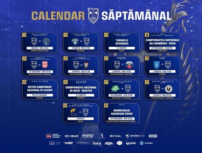 Sportivii de la CSM Constanța se pregătesc pentru zile pline, cu meciuri importante pentru echipele de volei, baschet, handbal, rugby și tenis de masă în ligile naționale, Divizia A, dar și în competițiile de tineret, cadeți și speranțe. Atleții participă la Campionatele Naționale de Masters, luptătorii își măsoară forțele cu adversarii din țară la un memorial, iar șahiștii participă la Campionatele Naționale de la Eforie Nord.