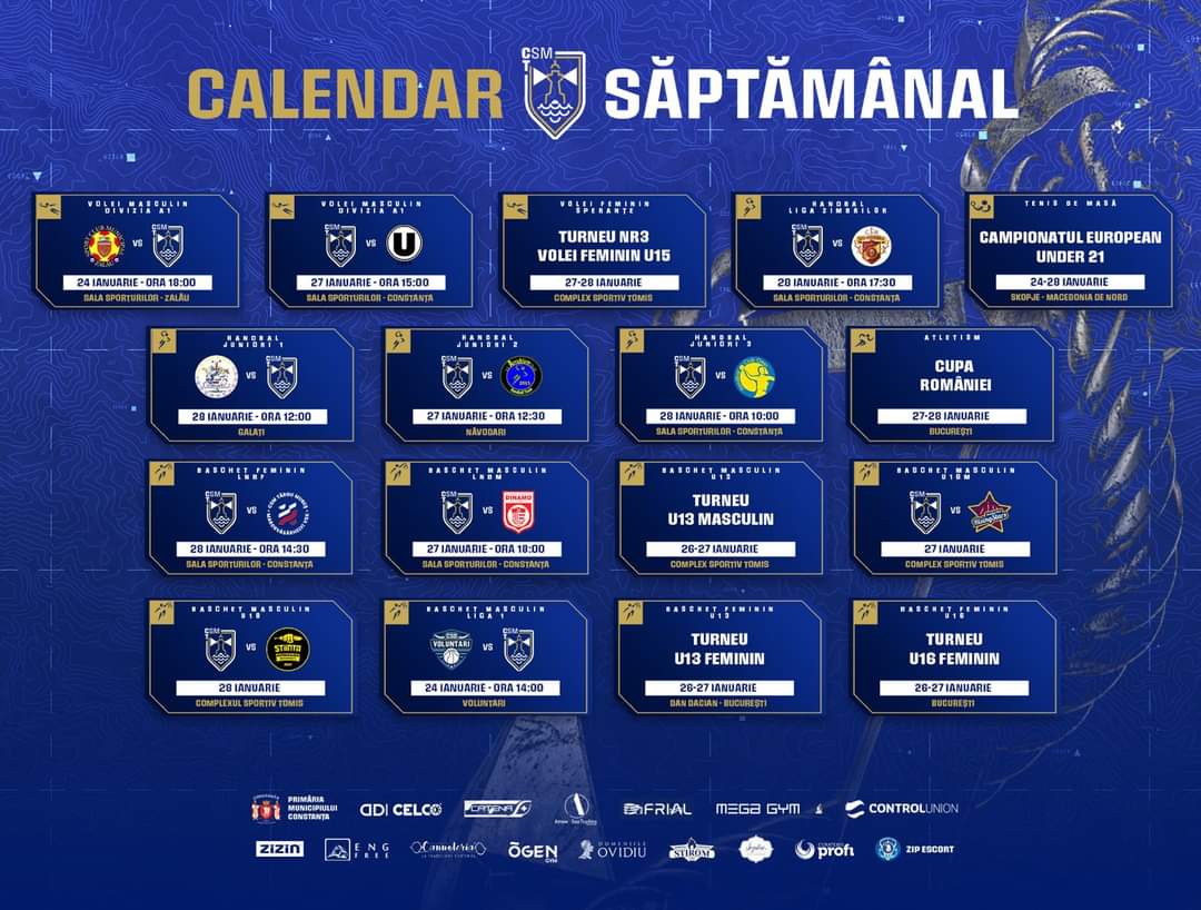 Pentru echipele de volei, handbal și baschet ale CSM Constanța urmeaza un weekend plin, cu meciuri în ligile naționale și competițiile de juniori, dar și un Campionat European U21 de tenis de masă, unde fetele luptă pentru medalii. Sâmbătă și duminică, constănțenii sunt invitați la Sala Sporturilor pentru un adevărat regal sportiv, și tot în weekend așteptăm vești de la atleți, care concurează la Cupa României. Tuturor, le urăm succes! Hai, Constanța! Hai, România!