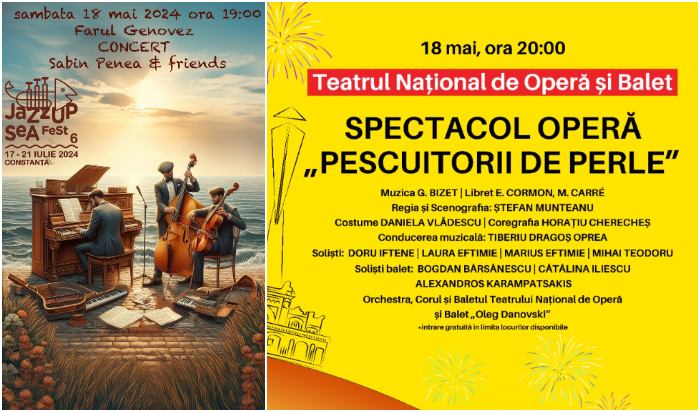 De la ora 19:00, pasionații de jazz sunt așteptați pe faleza Cazinoului din Constanța la concertul JazzUP Sea Fest, iar de la ora 20:00, la Teatrul Național de Operă și Balet „Oleg Danovski” va fi prezentat publicului spectacolul de operă „Pescuitorii de perle” de Georges Bizet. Vor interpreta pentru dumneavoastră soliștii: Doru Iftene, Laura Eftimie, Marius Eftimie și Mihai Teodoru. Corpul de balet va fi format din soliști: Bogdan Bârsănescu, Cătălina Iliescu, Alexandros Karampatzakis.
