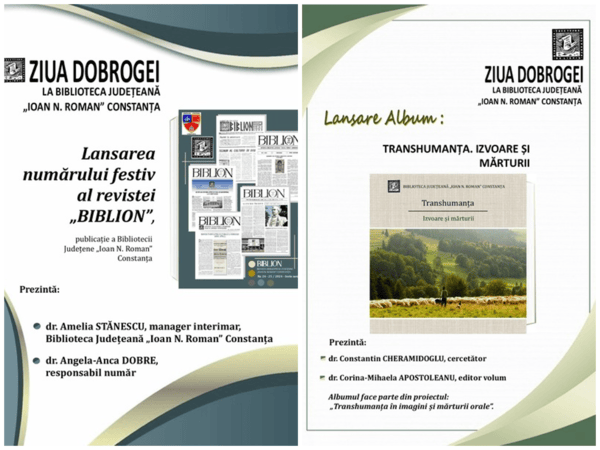 – 11.30 – Lansarea numărului festiv al revistei „Biblion”, publicație a Bibliotecii Județene „Ioan N. Roman” Constanța. Prezintă: dr. Amelia Stănescu, manager interimar; dr. Angela Anca Dobre, responsabil număr;