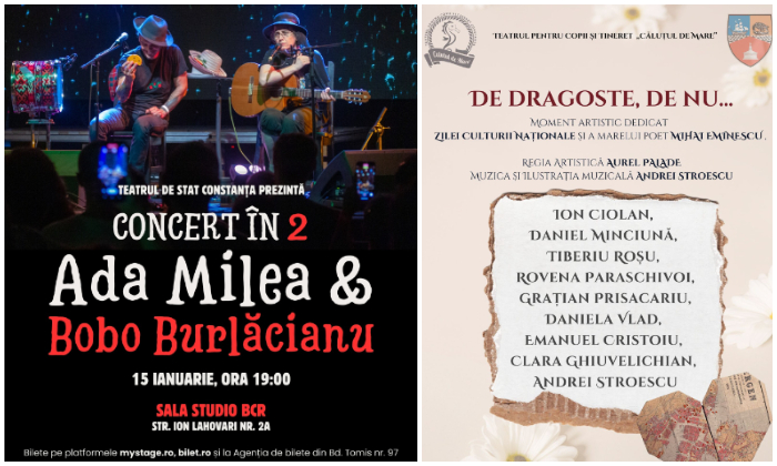 Teatrul de Stat Constanța va celebra Ziua Culturii Naționale cu un concert teatral al Adei Milea, la ora 19:00, iar la Teatrul Căluțul de Mare, începând cu ora 11:00, va avea loc spectacolul „DE DRAGOSTE, DE NU…”, dedicat publicului 12+.