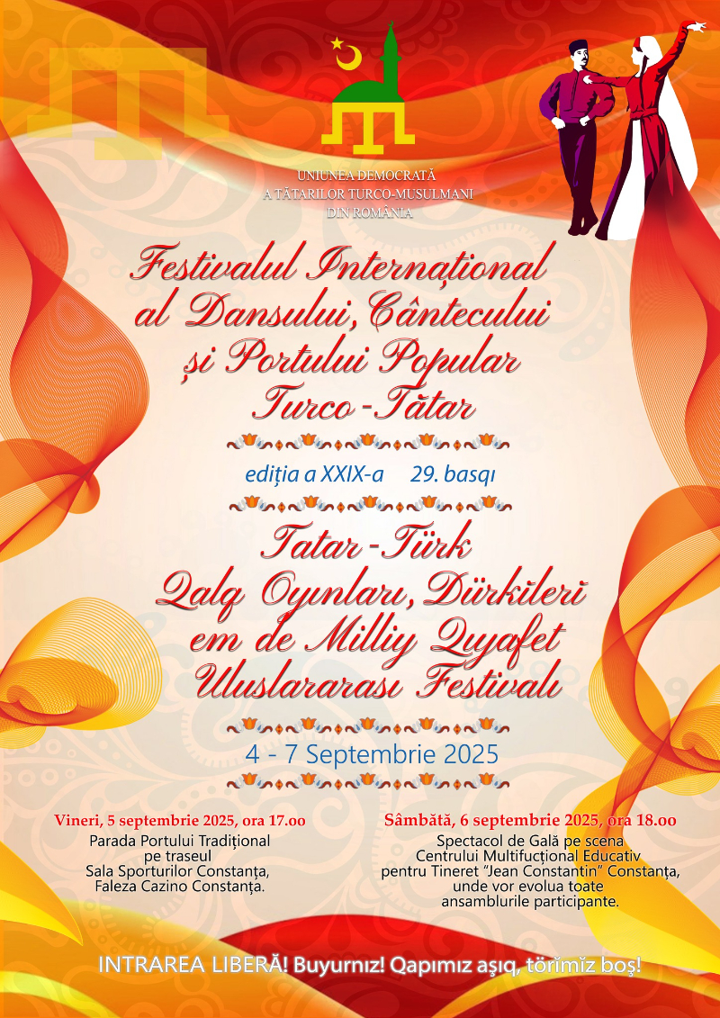 Uniunea Democrată a Tătarilor Turco-Musulmani din România organizează, în perioada 5-6 septembrie, cea de a XXIX-a ediție a Festivalului Internațional al Dansului, Cântecului și Portului Popular Turco-Tătar. Și de data aceasta, manifestarea va debuta cu parada portului popular, programată a avea loc vineri, 5 septembrie, începând cu ora 17.00.