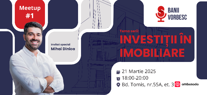 Banii Vorbesc, podcastul de investiții #1 din România, anunță cu entuziasm organizarea primei ediții a seriei de întâlniri dedicate educației financiare și investițiilor. Evenimentul, intitulat Banii Vorbesc Meetup #1, va avea loc pe 21 martie 2025, între orele 19:00 și 21:00, la Ambasada, situată pe Bd. Tomis, nr. 55A, et. 3