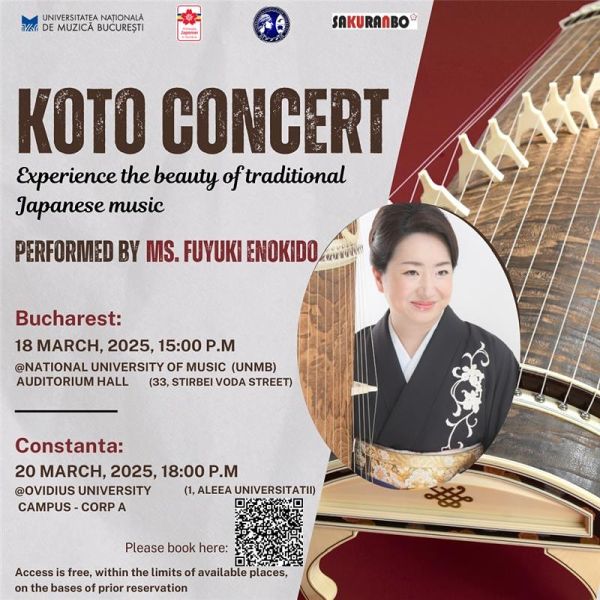 Ambasada Japoniei în România și Asociația Sakuranbo, în parteneriat cu Universitatea Ovidius Constanța, vă invită la un eveniment deosebit: Concert de KOTO, instrument tradițional japonez cu 13 corzi, cunoscut pentru sunetele sale delicate.