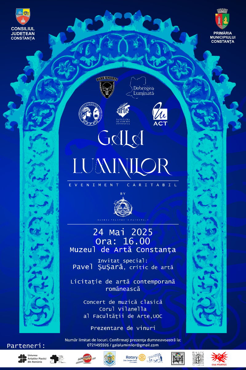 Gala Luminilor 2025 vă invită sâmbătă, 24 mai, începând cu ora 16.00, la Muzeul de Artă din Constanţa, la un regal cultural și filantropic de înaltă ţinută, organizat de Universitatea „Ovidius” din Constanţa, Facultatea de Arte, Muzeul de Artă, Asociaţia „Dobrogea Luminată”, Asociaţia Dark Knights, evenimentul fiind susţinut de Primăria Municipiului Constanţa şi Consiliul Judeţean Constanţa, în parteneriat cu Uniunea Artiştilor Plastici din România şi Uniunea Artiştilor Plastici din România – Filiala Constanţa Unu, Junkers Design, Marea Lojă Naţională din România, Rotary Club Cetatea Tomis Constanţa, Capitulul Alma, Music for Autism, Club Phoenix.