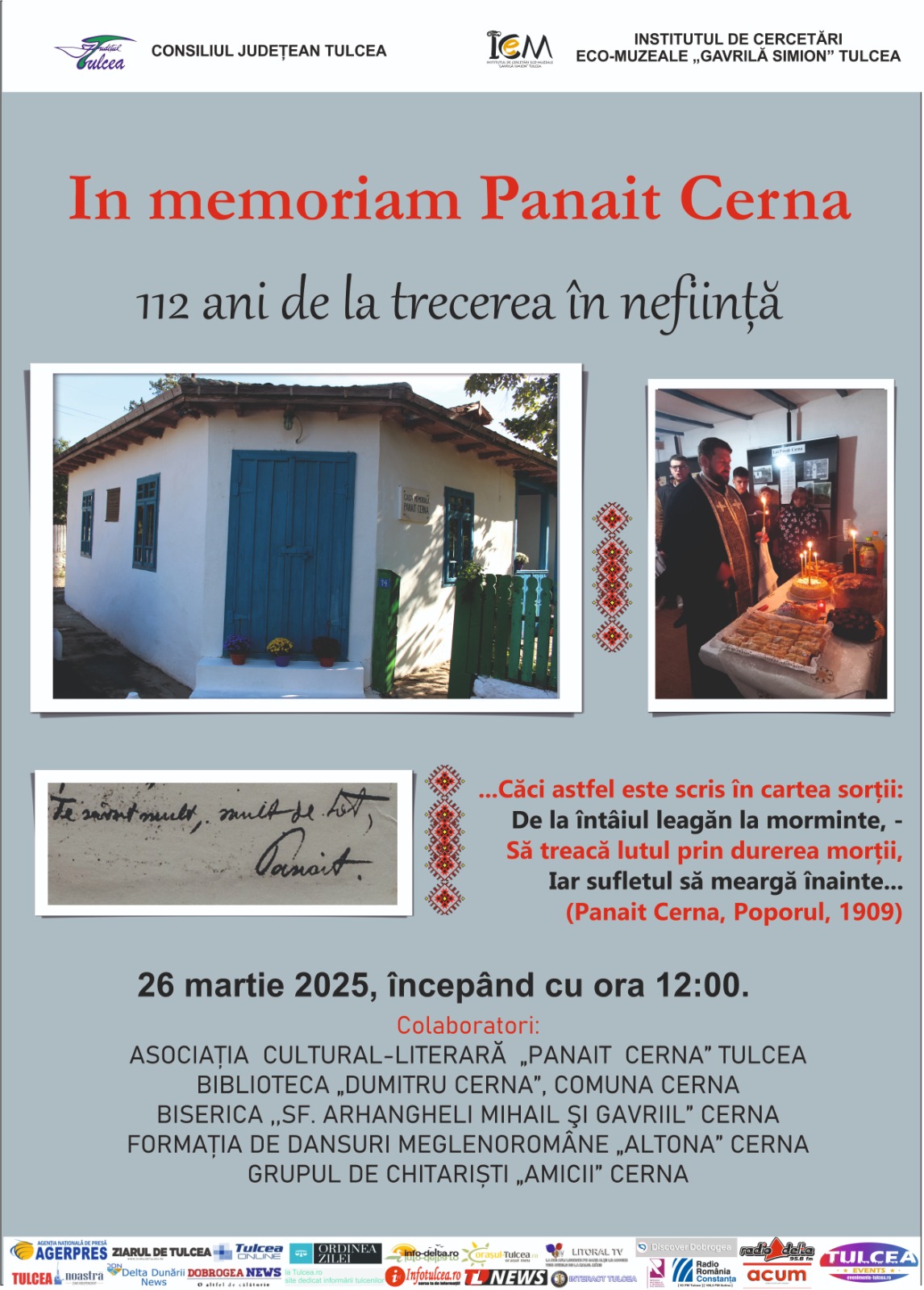 Institutul de Cercetări Eco-Muzeale ”Gavrilă Simion” Tulcea organizează miercuri, 26 martie 2025, evenimentul IN MEMORIAM PANAIT CERNA – 112 ani de la trecerea în neființă a poetului.