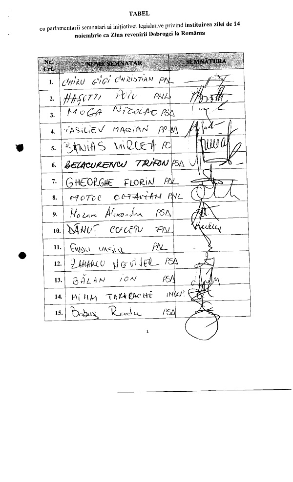 Sărbătorirea Zilei Dobrogei a fost inițită de senatorul, pe atunci, Christian Gigi Chiru și susținută de alți 26 de parlamentari, între care nume răsunătoare ale politicii dobrogene, precum Puiu Hașotti, Nicolae Moga, Alexandru Mazăre, Mihai Lupu, care au explicat că integrarea Dobrogei de Nord împreună cu unificarea principatelor române sub Principele Alexandru Ioan Cuza a marcat „începutul Marii Uniri” și că au fost un prim pas pentru „recunoașterea României că stat de către puterile europene” și „întemeierea statului român modern”.