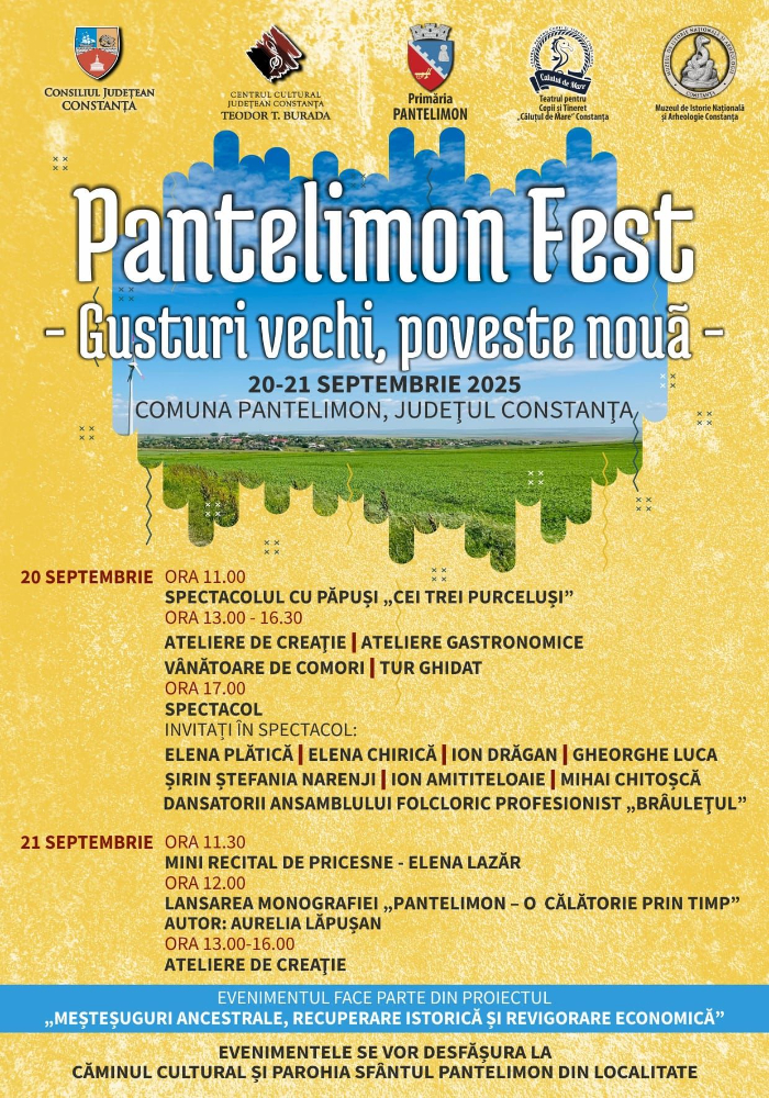 Centrul Cultural Județean Constanța Teodor T Burada vă invită, în acest weekend, 20 – 21 septembrie 2025, în comuna Pantelimon din județul Constanța, binecunoscută publicului pentru vecinătatea Cetății ULMETUM, la un eveniment special organizat în cadrul proiectului cultural-artistic „Meșteșuguri ancestrale, recuperare istorică și revigorare economică”.
