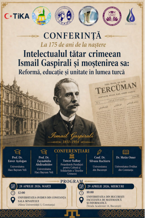 Uniunea Democrată a Tătarilor Turco-Musulmani din România în colaborare cu Agenția Turcă pentru Cooperare și Coordonare (TİKA), Facultatea de Istorie și Științe Politice a Universității „Ovidius” din Constanța, Facultatea de Istorie a Universității din București și Centrul de Studii Turce organizează conferința cu tema „Intelectualul tătar crimeean Ismail Gaspirali și moștenirea sa: Reformă, educație și unitate în lumea turcă, la 175 de ani de la naștere”.